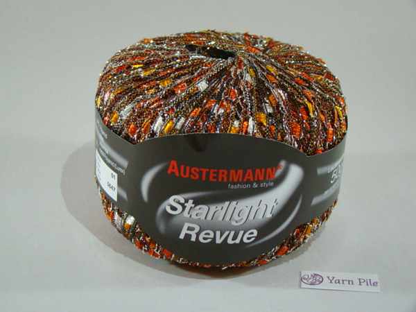 Austermann Starlight Revue 01 94% Polyamide Nylon 6% Lurex 50 grams, 150metres 16 sts 28 rows 10cm 4-5.5mm needles recommended Do not use fabric conditioner For FREE Austermann Patterns click here