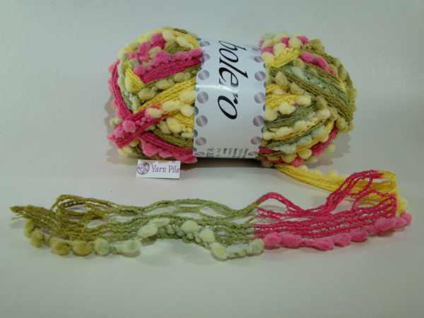 Designer Yarns Bolero 07 Green, Yellow & Fuchsia 100% Polyester 100 grams, 25 metres 8-9m (US 11-13) needles recommended Instructions for scarf on ball band 1 ball for short scarf, 2 balls for long scarf