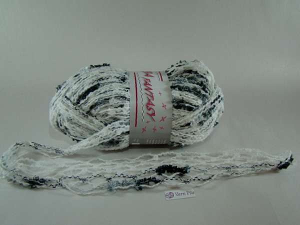 Rumba Fantasy 01 White/Black 100% Acrylic 100 grams, 30 metres/32 yards 8-9m (US 11-13) needles recommended 2 sts 2.5cm Instructions for scarf on ball band 1 ball for short scarf, 2 balls for long scarf