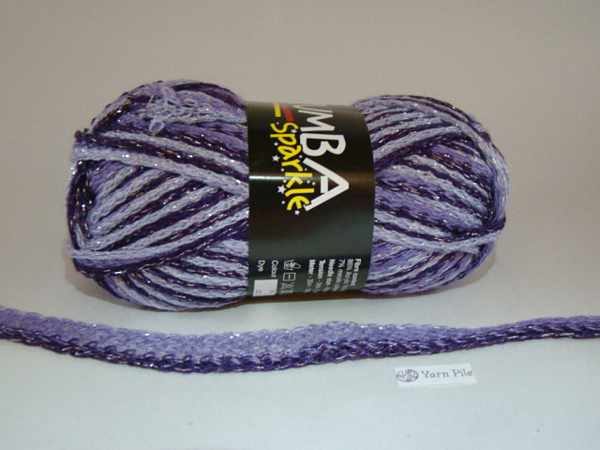 Rumba Sparkle 06 Purples 86% Acrylic 7% Polyester 7% Metallic polyester 100 grams, 30 metres 8-9m needles recommended 2 sts 2.5cm Instructions for scarf on ball band
