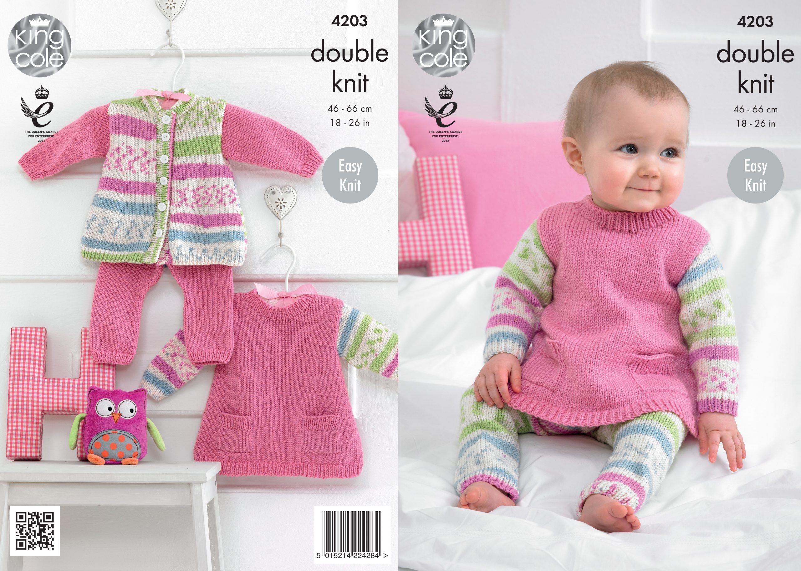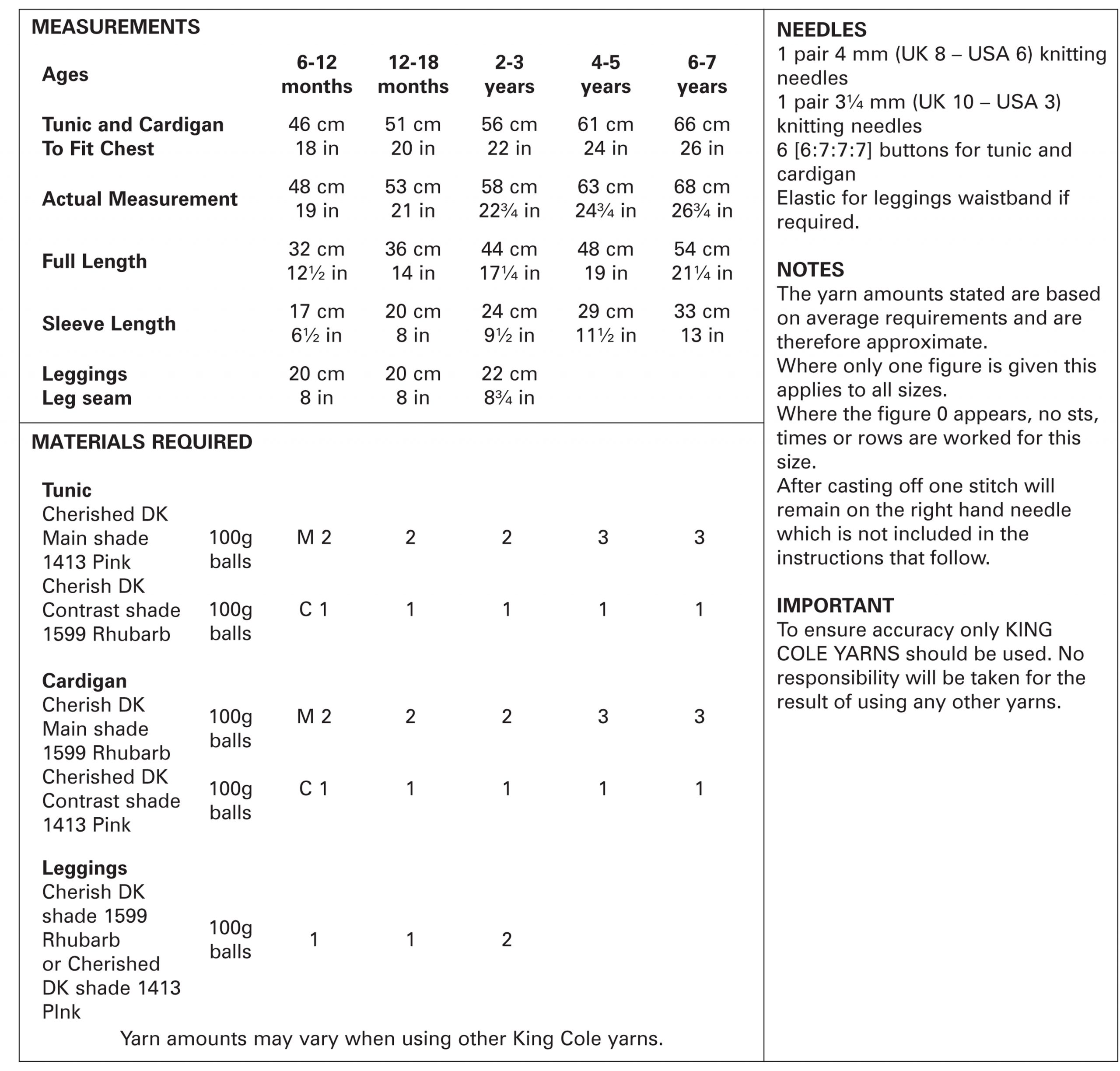 King Cole Pattern 4203 Cherish & Cherished DK Tunic, Cardigan & Leggings 41-66cm, 16-26in.?? 0-7 years Tunic:? 2 balls of Main & 1 of Contrast for sizes: 18, 20 & 22, 3 balls of Main & 1 of Contrast for size:? 24 & 26 in Cardigan:? 2 balls of Main & 1 of Contrast for sizes: 18, 20 & 22, 3 balls of Main & 1 of Contrast for sizes 24 & 26 in Leggings:? 1 ball for leg seam: 8, 2 balls for leg seam 8 3/4 in King Cole Cherish DK & Cherished DK 100gm, also suitable for other King Cole DK yarns, amounts may vary. Shades 1413 Pink & 1599 Rhubarbshown on pattern.