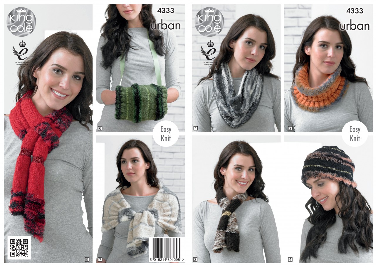 King Cole Pattern 4333 Snood/Cowl, Neck Roll, Beannie, Scarf, Neck Wrap, Shoulder Wrap, Muffler Urban Easy Knit One Size Snood/Cowl;? 1 ball Neck Roll:? 1 Ball Neck Wrap:? 1 Ball Beanie:? 1 Ball Scarf:? 1 Ball Muffler:? 1 Ball Shoulder Wrap:? 2 Balls King Cole Urban 100gm. As shown on pattern, Snood/Cowl shade 1224 Hobby, Neck Roll shade 1229 Kestrel, Neck Wrap:? shade 1225 Buzzard, Beanie:? 1 Ball shade 1226 Peregrine, Scarf shade 1227 Red Kite, Muffler 1228 Goshawk, Shoulder Wrap shade 1223 Osprey.