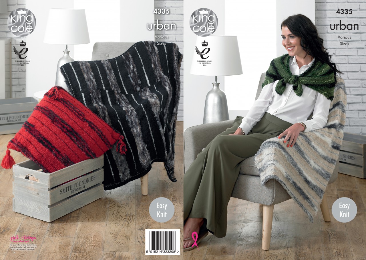 King Cole Pattern 4335 Blankets, Throw, Cushion & Wrap Urban Easy Knit Small Blanket;? 3 balls Medium Blanket:? 5 Balls Throw:? 6 Balls Large Cushion:? 3 Balls Triangular Wrap:? 2 Balls King Cole Urban 100gm. As shown on pattern, Small Blanket shade 1223 Osprey, Medium Blanket shade 1223 Osprey, Throw shade 1230 Merlin, Large Cushion shade 1227 Red Kite, Triangular Wrap shade 1228 Goshawk
