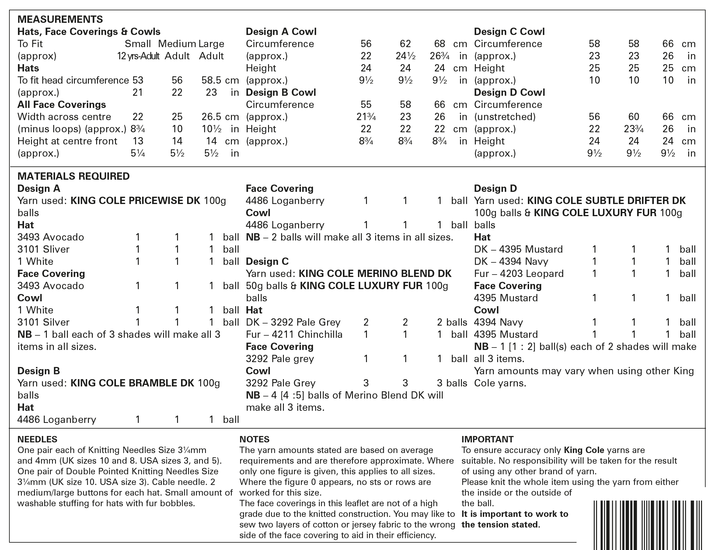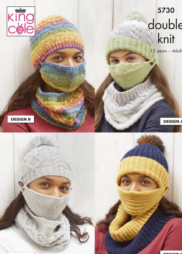 King Cole Pattern 5730 Hats, Face Coverings and Cowels DK