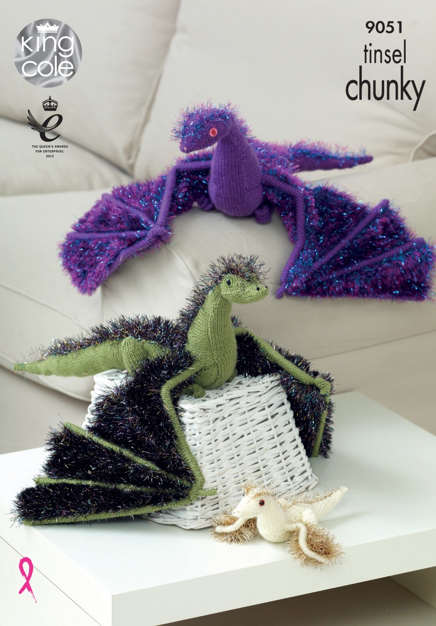 King Cole Pattern 9051 Dragons Adult Dragon has an approximate wingspan of 60cm, and body length approximately 50cm Baby Dragon Measures approximately 15cm nose to tail Adult Dragon:? 2 balls Tinsel Chunky & DK Baby Dragon:? 1 ball Tinsel Chunky & DK Shades Shown:? Adult: Tinsel Chunky 1784 Sparkler & 1779 Cocktail, Pricewise DK 307 Crocus & 272 Grass ??????????????????????? Baby:? Tinsel Chunky 1710 Ingot, Pricewise DK 46 Natural