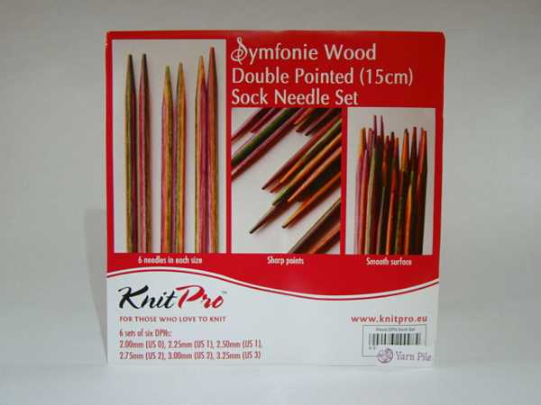 KnitPro Symfonie Wood Double Pointed (15cm) Sock Needle Set KnitPro Symfonie wood double pointed needles (15cm) inclear plastic case Set of 6 double pointed needles 6 needles in each size: 2.00mm, 2.25mm, 2.50mm, 2.75mm, 3.00mm, 3.25mm