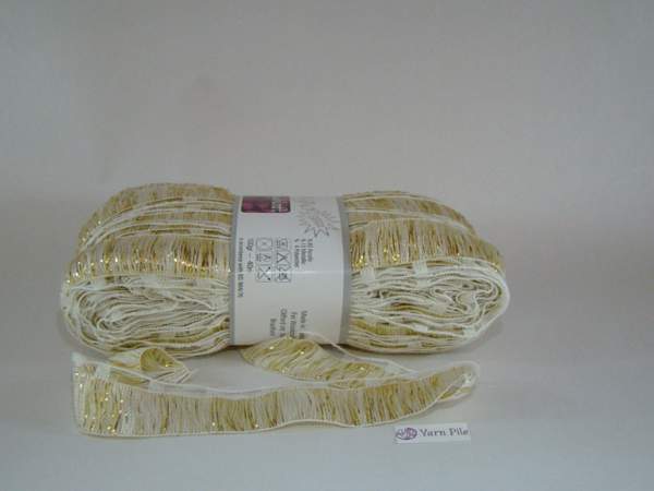 Woolcraft Tango Glitz Gold 83% Acrylic 13% Metallic 4% Polyester 100 grams, 40metres 5.5mm needles recommended (US8) Instructions for scarf on ball band